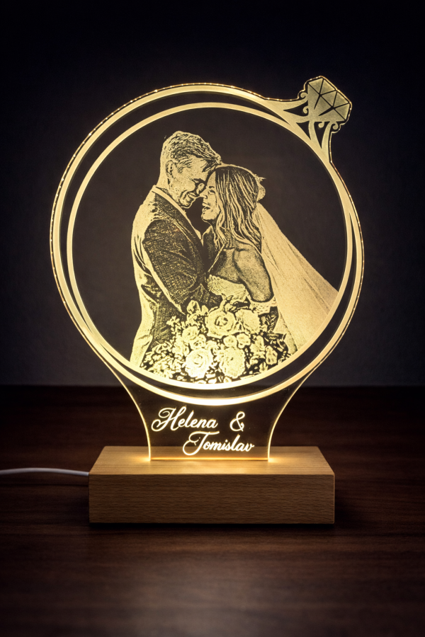 Preciznim laserskim graviranjem portret se prenosi na prozirnu akrilnu ploču, a toplo LED svjetlo nježno ističe svaki detalj. Drveno LED postolje daje prirodan i moderan izgled, savršeno uklopiv u svaki interijer – spavaću sobu, dnevni boravak ili noćni ormarić.